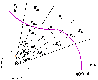 離散為,即,這樣就把整個(gè)坐標(biāo)空間分成個(gè)以原點(diǎn)為圓心、為射線角的扇形,它們與失效邊界的交點(diǎn)處的特征半徑記為,如圖5.1所示。記為獨(dú)立的二維標(biāo)準(zhǔn)正態(tài)變量空間中以原點(diǎn)為圓心、半徑為的圓形區(qū)域內(nèi)側(cè)的聯(lián)合概率密度函數(shù)的積分(以下類同),則有[1]